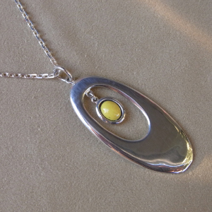 まず、オーバル型のスターリングシルバーと黄色のエナメルを組み合わせたペンダントです。茶色のモヘアニットとの相性も抜群で、とっても上品です!