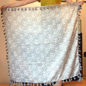 グレーのコットン生地に、白い花柄プリントのストールです。一辺の長さが約100センチある大判の正方形で、タッセルが贅沢に取付けられています。