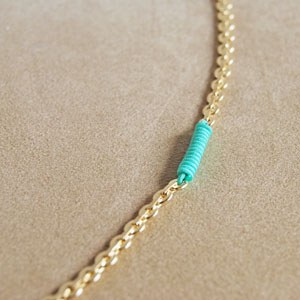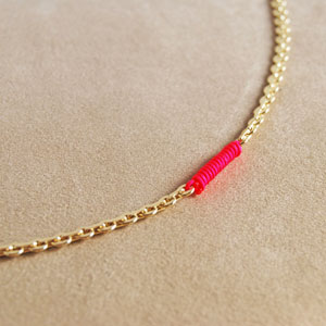 まずはネックレス。スパンコールのようなカタチのパーツを連ねたユニークなチェーンに、組み紐のようなストリングでアクセント。色は、レッド、フューシャ、アクア、ダークグレーの4色をご用意しました。