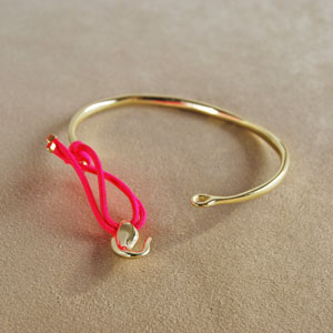 手首にぴったりと収まります。上のブレスレットはカジュアルな印象ですが、こちらのバングルは、きれいめな装いにも合わせていただけます。