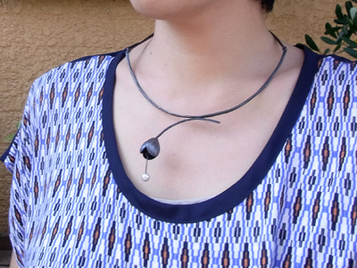 フェミニンなシルバーモチーフに、燻し加工を施し、グレーの天然パールを組み合わせることで、きりっとした印象をプラスしています。