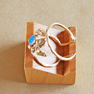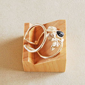 クローバーの葉を彼女流にデザインしてかたどった台座の中央には、カボションカットされたストーンが美しく輝きます。ストーンは、オパール、ムーンストーン、ブラックスターの3種類。アーム部分がオープンになったフリーサイズです。