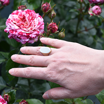 大ぶりですが、下のモデルさんのように小指につけるのがデザイナーのお気に入り。