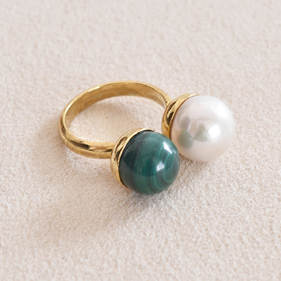 マラカイトとパールのダブルモチーフが印象的なリングもあります。