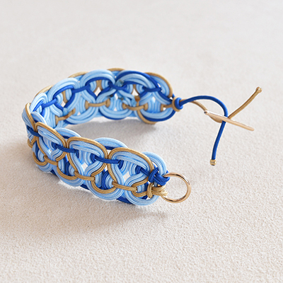 幅2.3センチのワイドなブレスレット。3色のストリングを丁寧に手で編んで創り出す模様は、どこかオリエンタルな趣です。