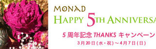 ファッション モナド5周年記念 THANKS キャンペーン開催! 東京も開花宣言がありましたね。陽射しも暖かくなり、春の気配に満ちてきました。さて、モナド 5 周年記念 THANKS キャンペーンのご案内です。この3月でモナドは、5周年を迎えました。2008年に表参道の裏路地でスタートし、2010年に根津... 2013.03.17 ファッションモナドのこと